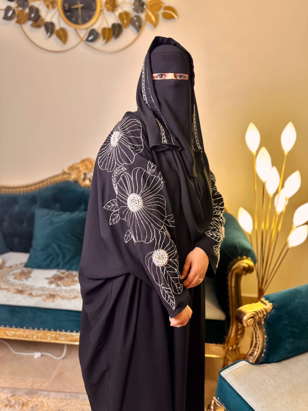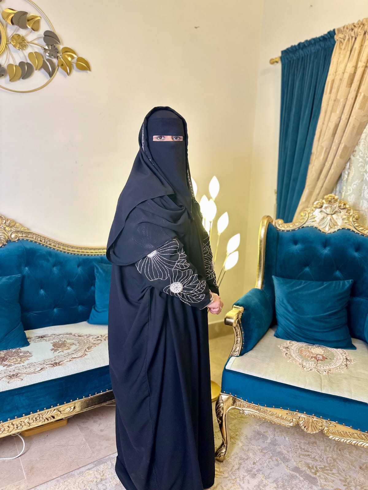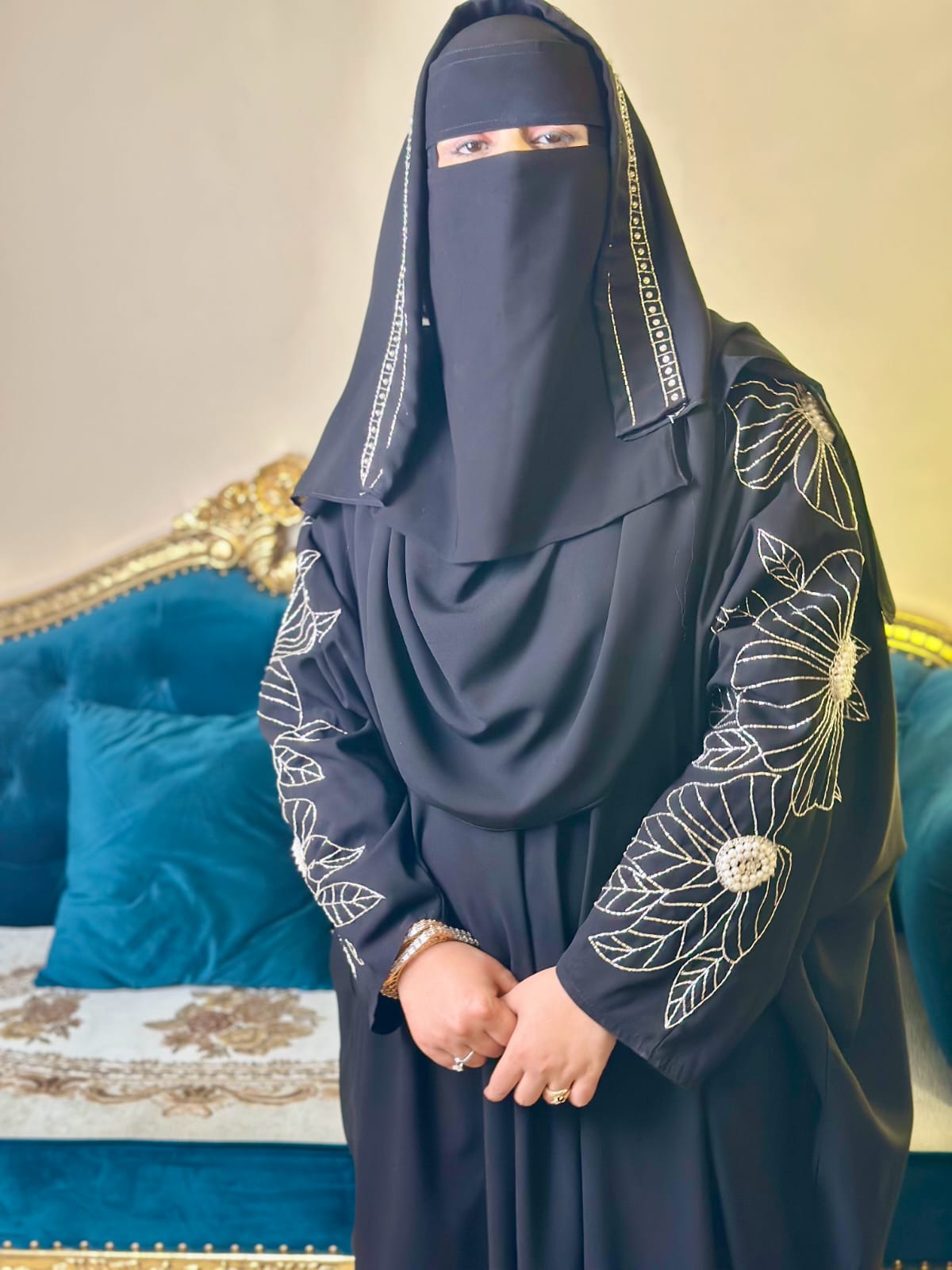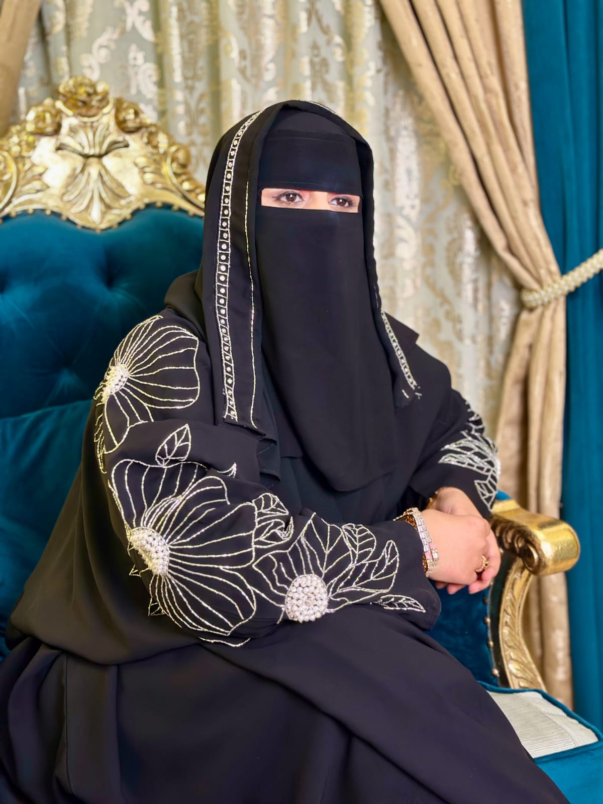 Elevate your modest wardrobe with the Zahra Elegance Abaya, crafted with exquisite attention to detail using premium original Korean Nida fabric. Designed by Uroosa Vayani, this abaya features handmade floral cutwork embroidery with pearl accents, combining tradition with timeless elegance.