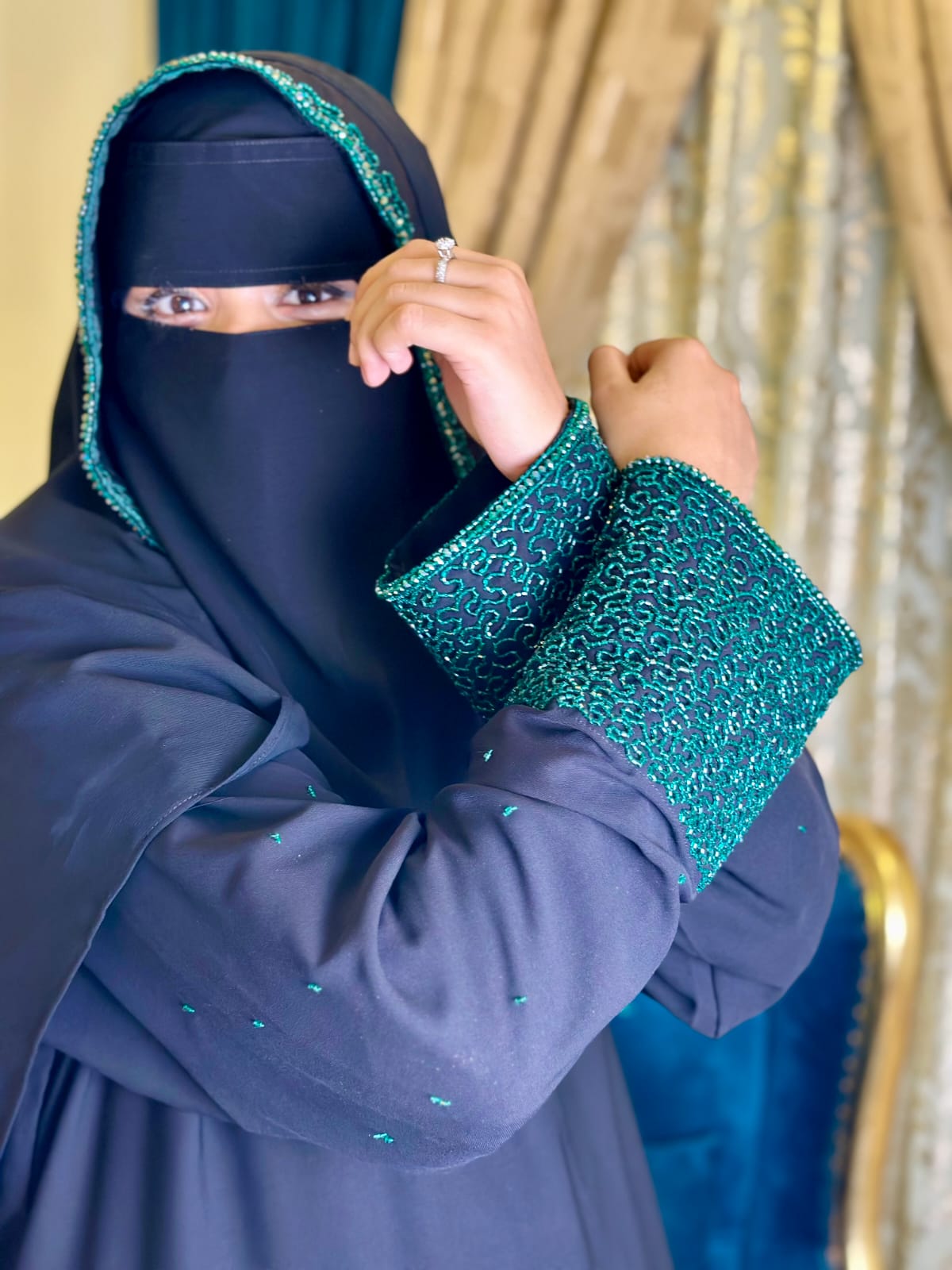 The Zumurrud Al-Layl is a striking handmade Arabian bride abaya, designed by Uroosa Vayani, crafted from original Korean Nida fabric in a beautiful green hue. This luxurious abaya is adorned with intricate handmade Cut work, adding a unique and dazzling touch of elegance to the piece. The soft and flowing fabric, combined with the fine craftsmanship, makes it a perfect choice for brides seeking a balance of traditional and modern beauty. The abaya features a button-through front opening, a flattering V neckline, and full sleeves with stunning Cut detailing, creating a look of sophistication and grace.